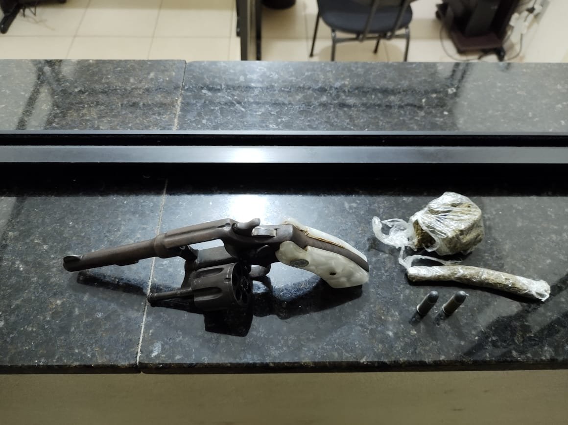 Durante a revista no carro os policiais encontraram no porta-luvas um revólver calibre 22 com duas munições intactas e embaixo do banco do passageiro havia duas porções de maconha.