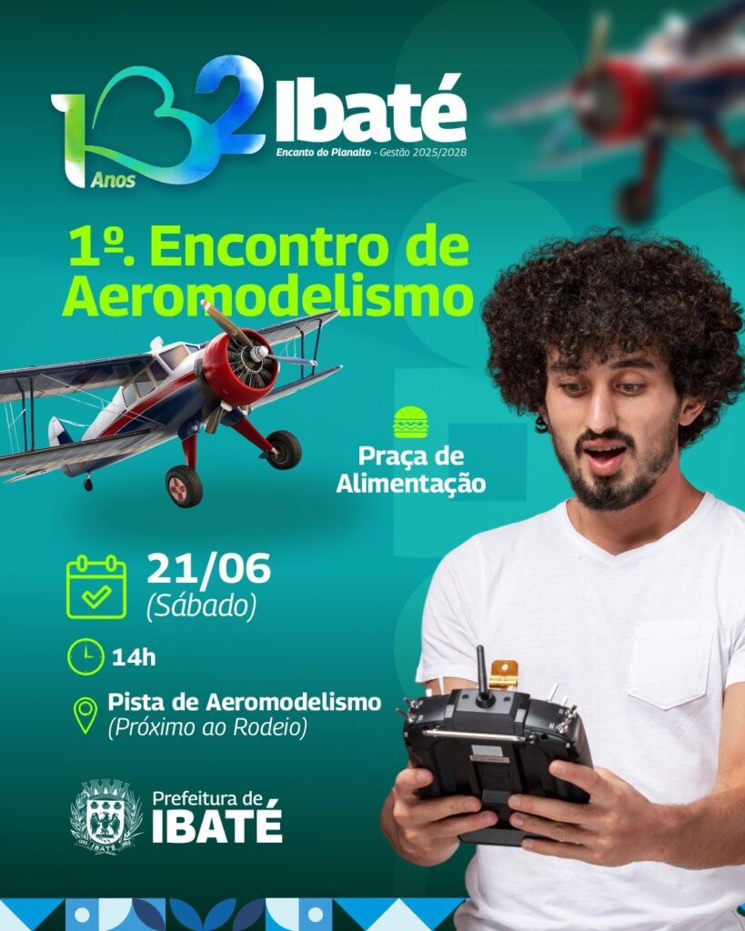 Dando sequência às comemorações pelos 132 anos de Ibaté, a cidade promove neste sábado, dia 21 de junho, o 1º Encontro de Aeromodelismo, à partir das 14h, na pista de aeromodelismo, localizada próxima ao local onde tradicionalmente é realizado o rodeio.