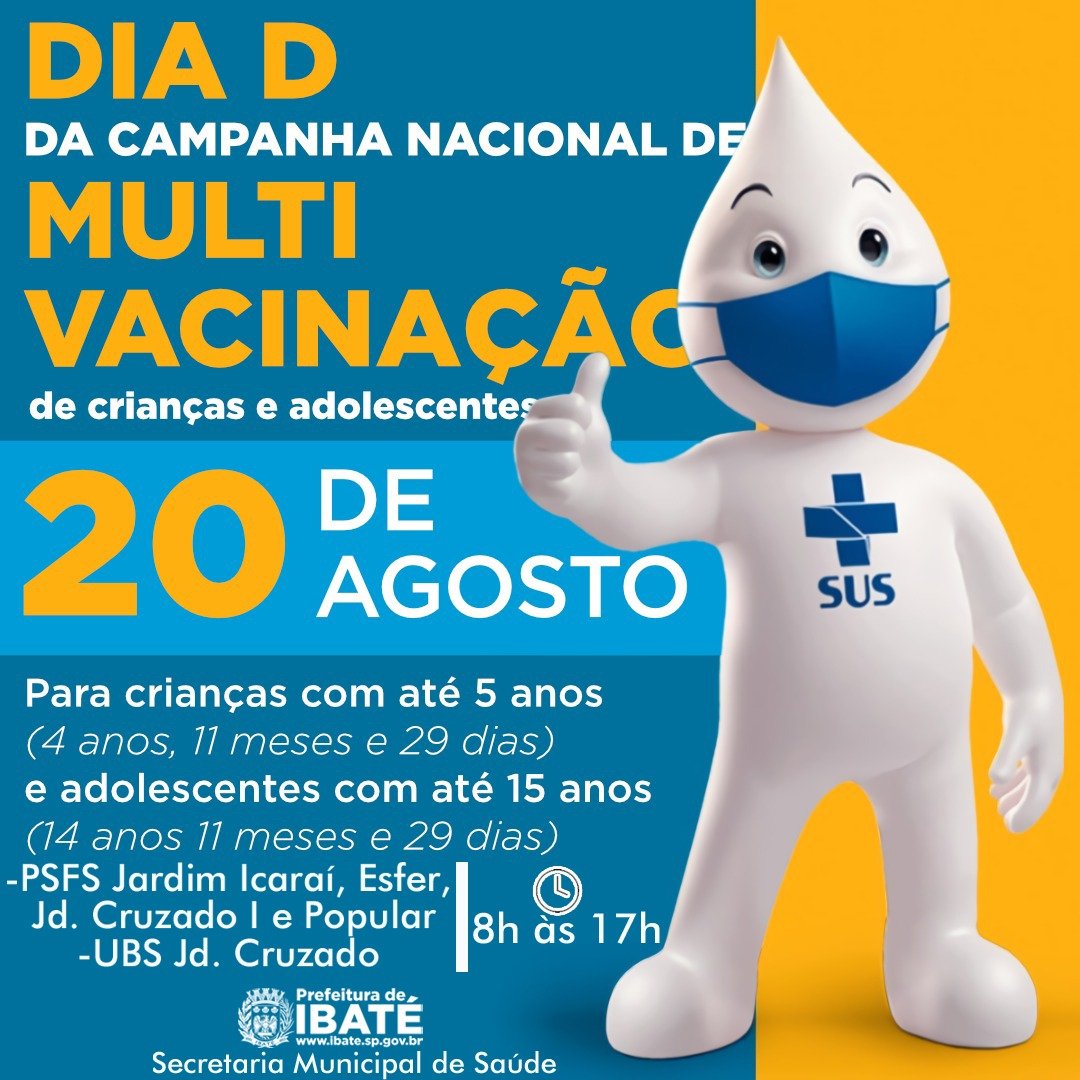 A Secretaria Municipal da Saúde de Ibaté, por meio da Vigilância Epidemiológica, realiza o Dia D da Campanha de Multivacinação 2022, neste sábado (20), das 8h às 17h.
