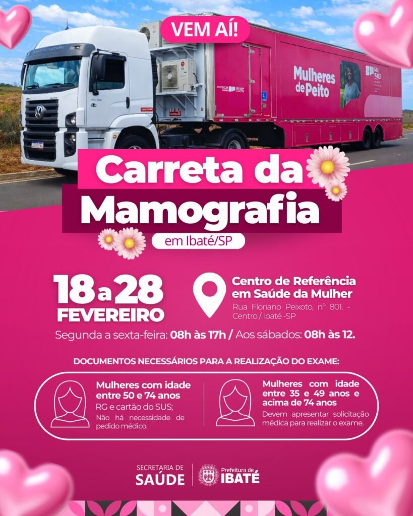 O município de Ibaté recebe nesta quarta-feira a Carreta de Mamografia do Governo do São Paulo, por meio da Secretaria de Estado da Saúde de São Paulo, dentro do programa Mulheres de Peito.