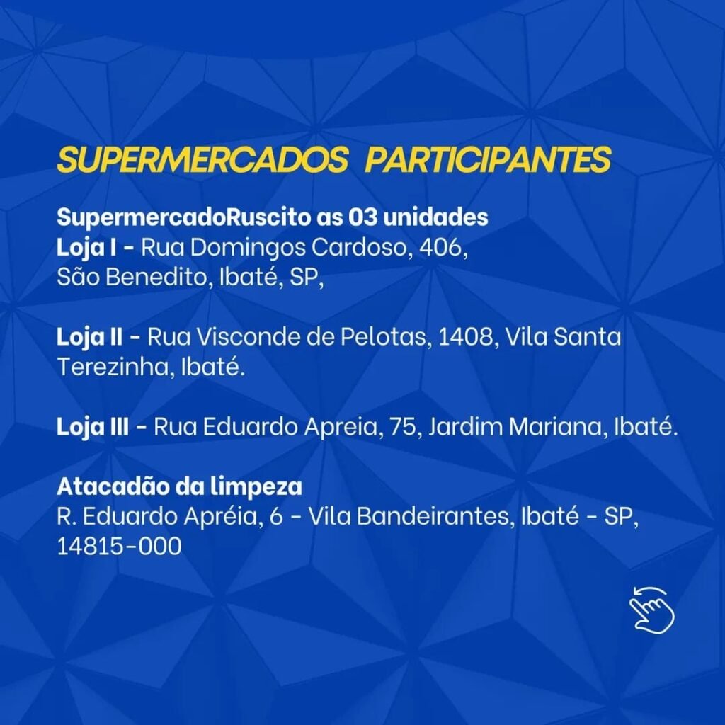 Em Ibaté você participa da promoção comprando nas 3 lojas do Supermercados Ruscito e no Atacadão da Limpeza Ibaté.
