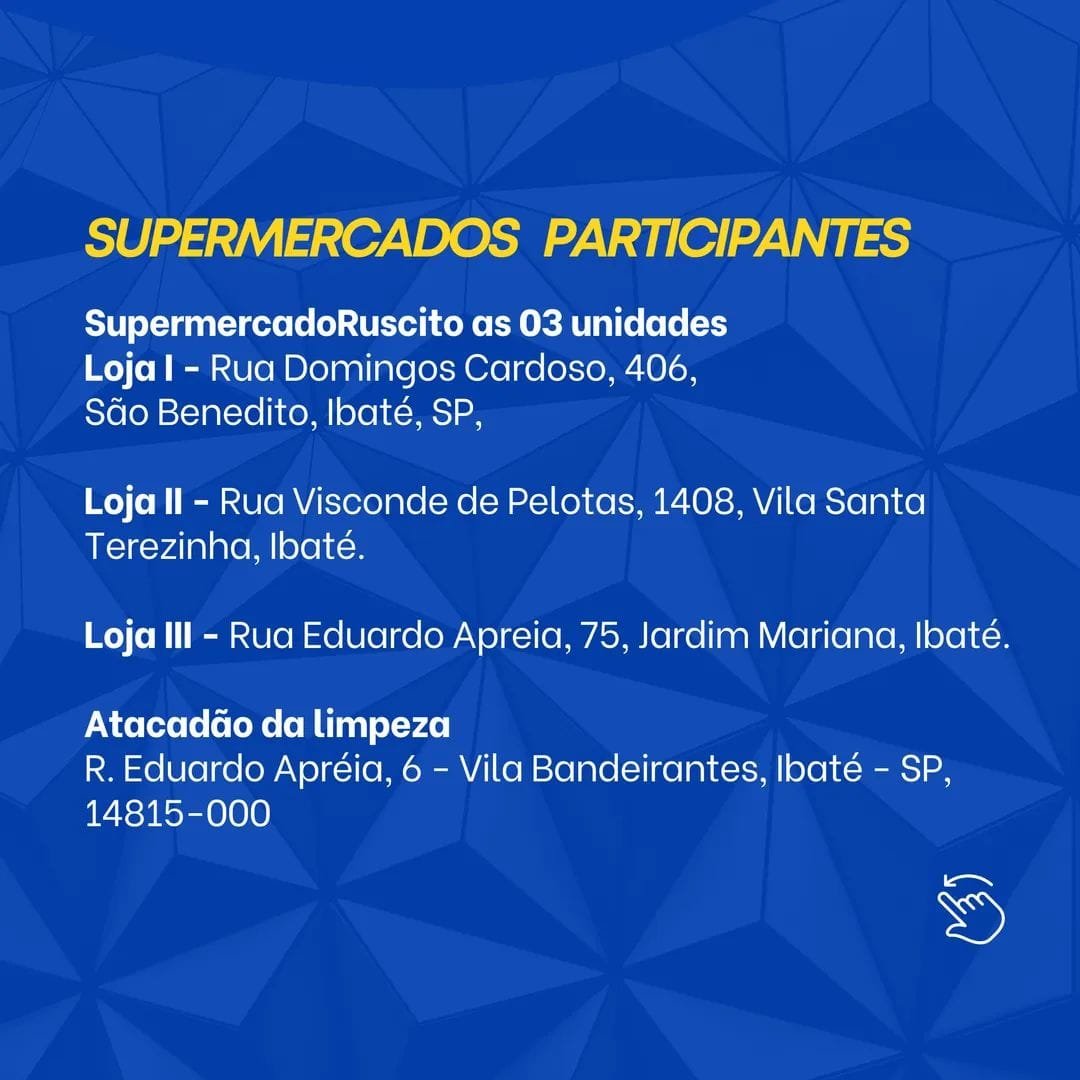 Em Ibaté você participa da promoção comprando nas 3 lojas do Supermercados Ruscito e no Atacadão da Limpeza Ibaté.