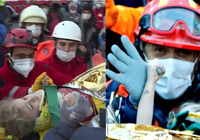 Uma menina de três anos foi resgatada com vida nesta segunda-feira, 1º, de um prédio que desabou na cidade turca de Izmir. Foi um verdadeiro milagre e as equipes de resgate comemoraram.