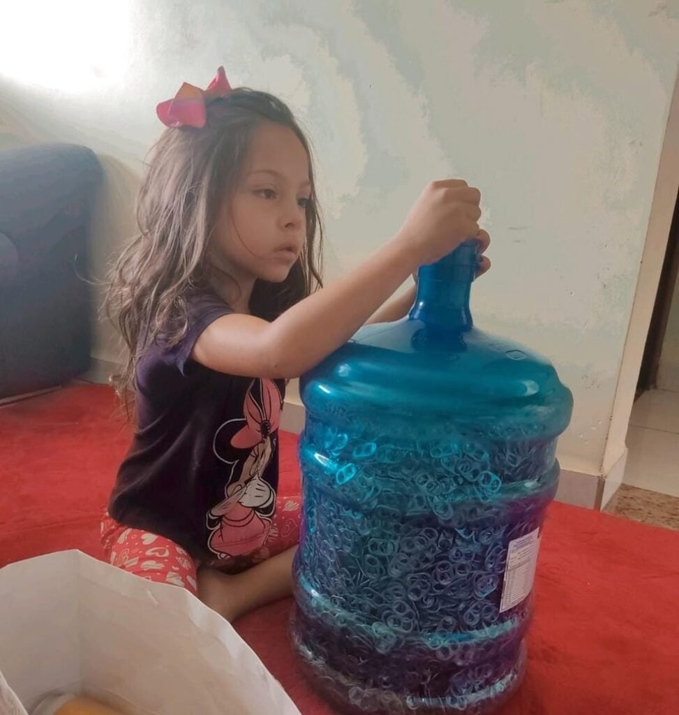 Além da arrecadação para alcançar o objetivo pessoal, Emanuelly também participa de uma iniciativa semelhante na escola onde estuda. Eles coletam lacres que são destinados, depois, a uma organização sem fins lucrativos (ONG).