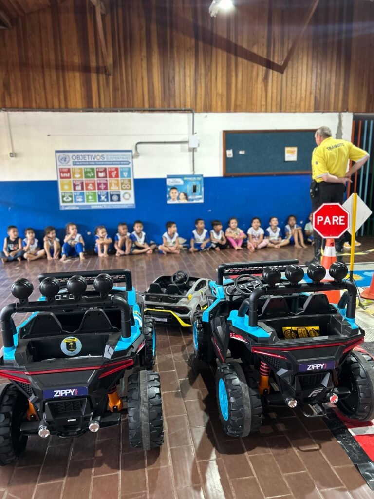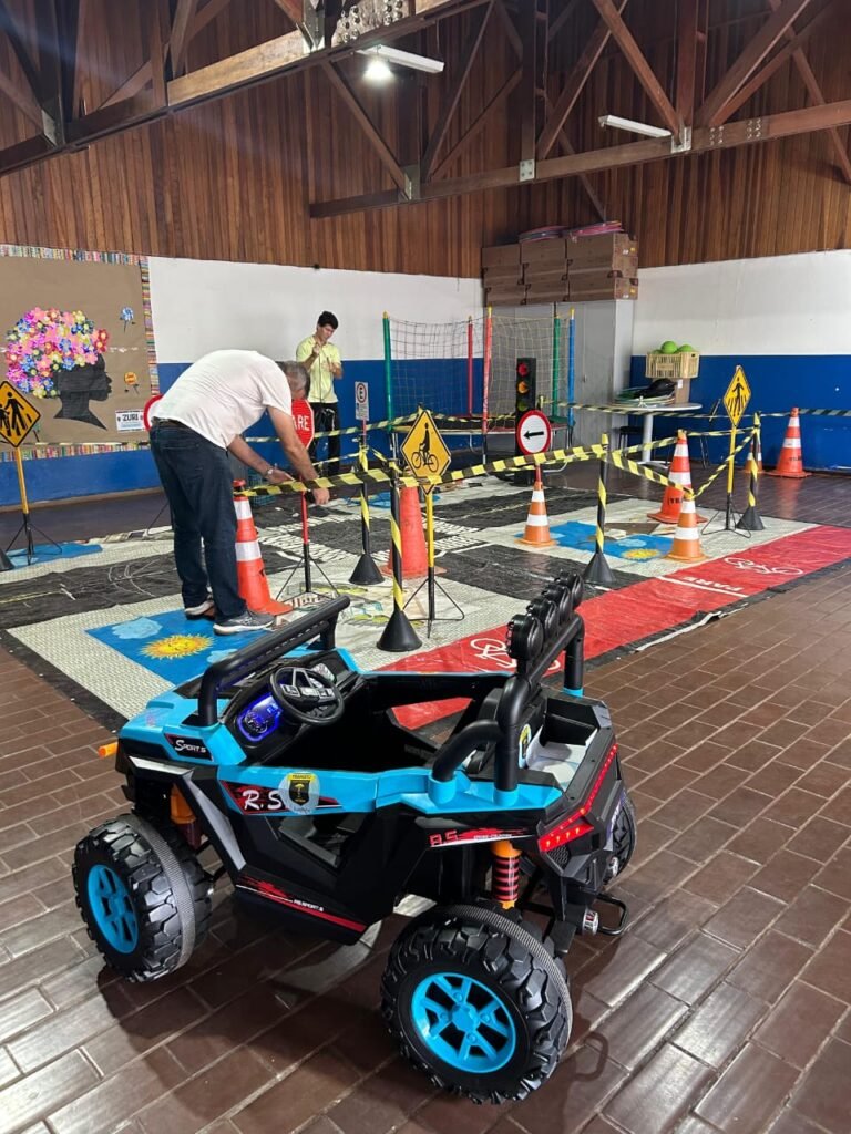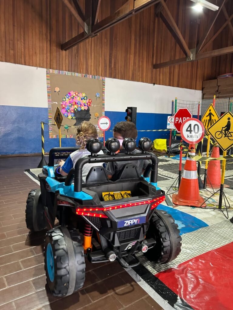Na sequência, as crianças participam da vivência prática no circuito da minicidade, conduzindo carros elétricos infantis e enfrentando situações simuladas do cotidiano urbano, sempre com acompanhamento de monitores que reforçam os conceitos apresentados.