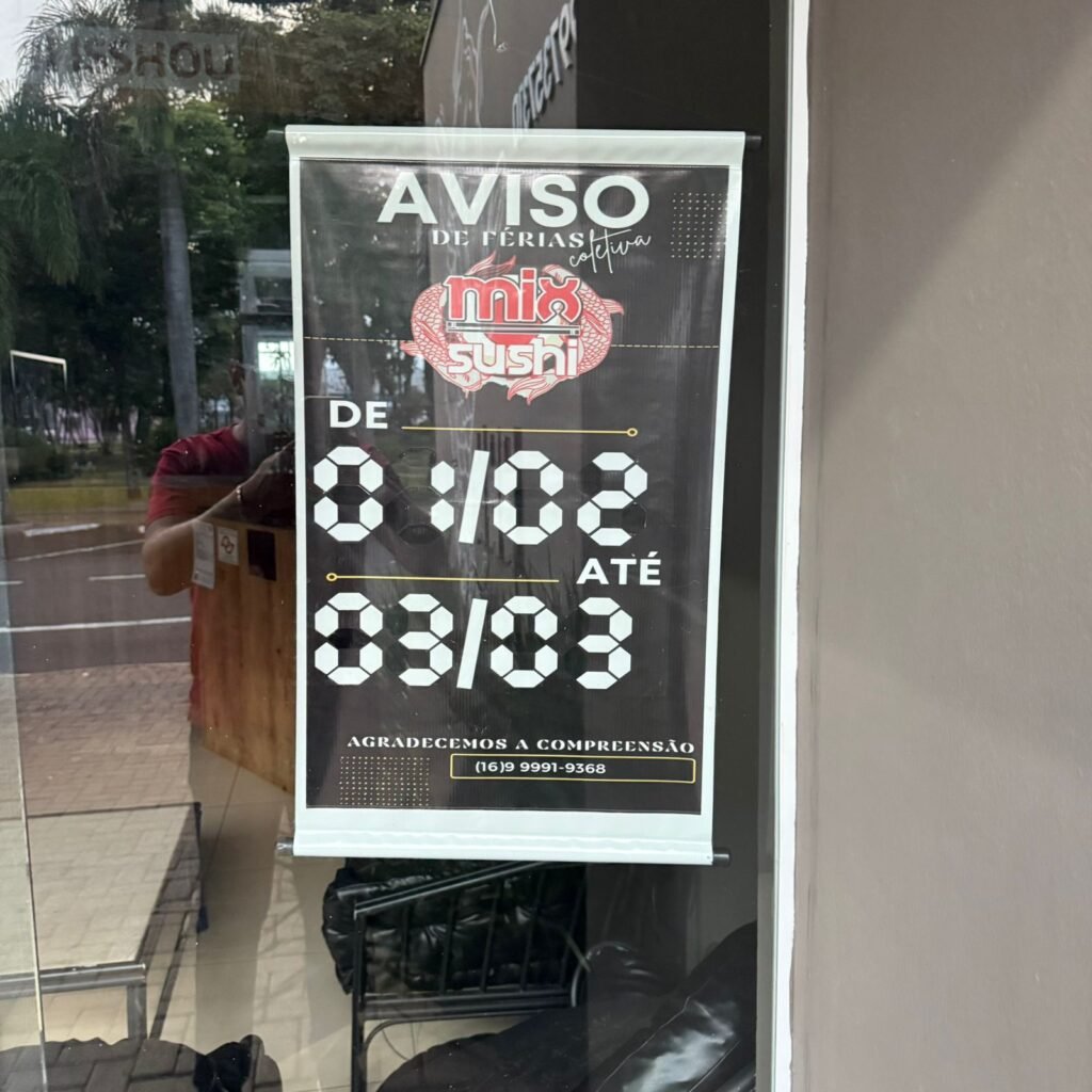 O Mix Sushi Ibaté comunicou aos clientes que está em período de férias, fazendo uma breve pausa no atendimento para descanso e organização.