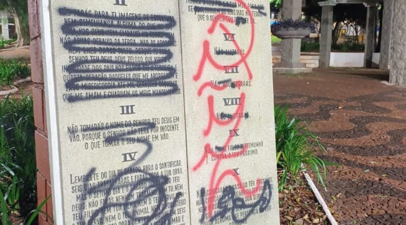 Um ato de vandalismo revoltante atingiu neste final semana um importante símbolo religioso localizado na Praça Santa Cruz, em São Carlos. O monumento com os Dez Mandamentos da Bíblia Sagrada, instalado pela Igreja Adventista do Sétimo Dia, foi pichado com símbolos comunistas e teve parte de suas inscrições danificadas. A ação criminosa segue o mesmo padrão de outras ocorridas recentemente na cidade, que já incluíram pichações na estátua do Conde do Pinhal, em semáforos e em outros espaços públicos.