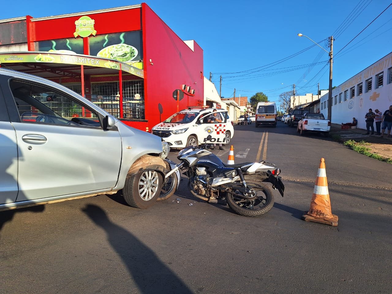 De acordo com informações obtidas pelo repórter Maicon Ernesto no local do acidente, o carro ao tentar fazer uma conversão para entrar na Rua Dr. João Oliveira não visualizou a motocicleta que vinha no sentido oposto, o impacto frontal não pode ser evitado. A mulher que pilotava a moto precisou ser socorrida pelo SAMU, sendo encaminhada para a Santa Casa, já motorista do carro não precisou de atendimento.