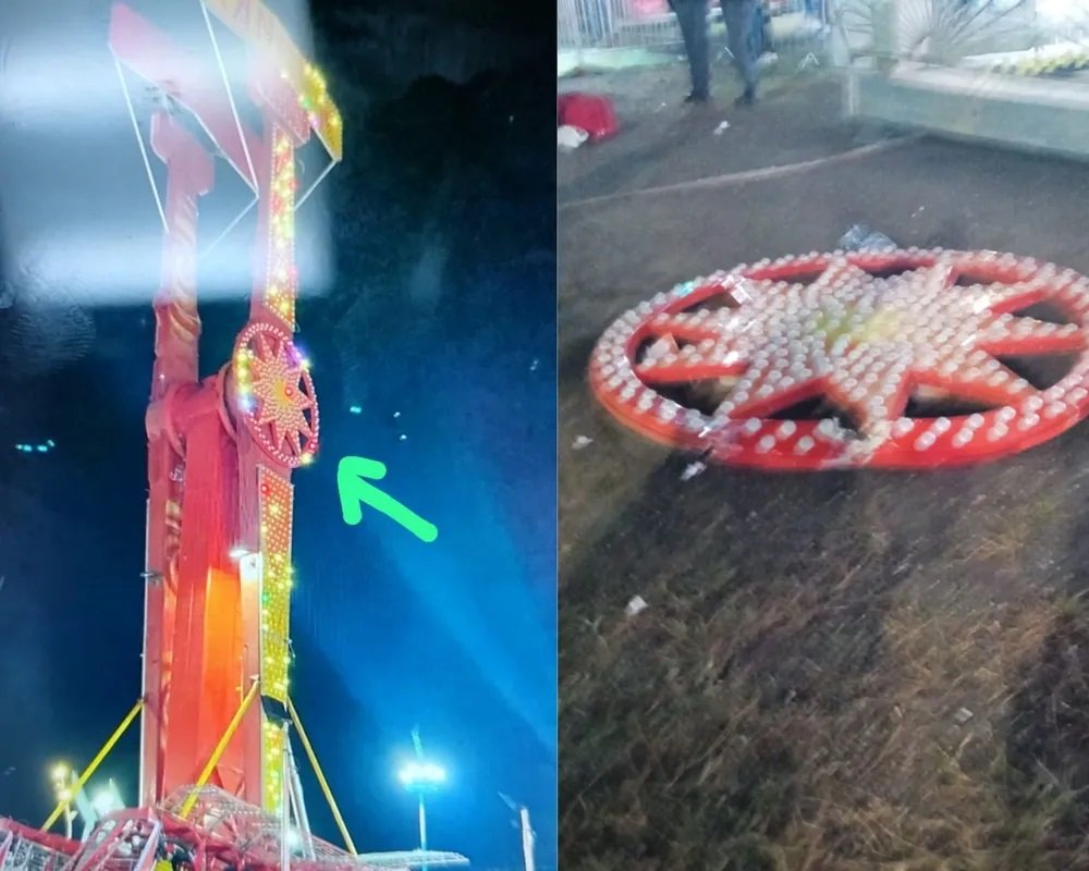 Imagens obtidas pelo g1 mostram o momento em que uma peça redonda, com um desenho de estrela, se solta e cai de forma violenta. O objeto faz parte da haste central do brinquedo, no ponto de eixo. Duas cabines com os passageiros fazem um movimento de 360° em torno dele.