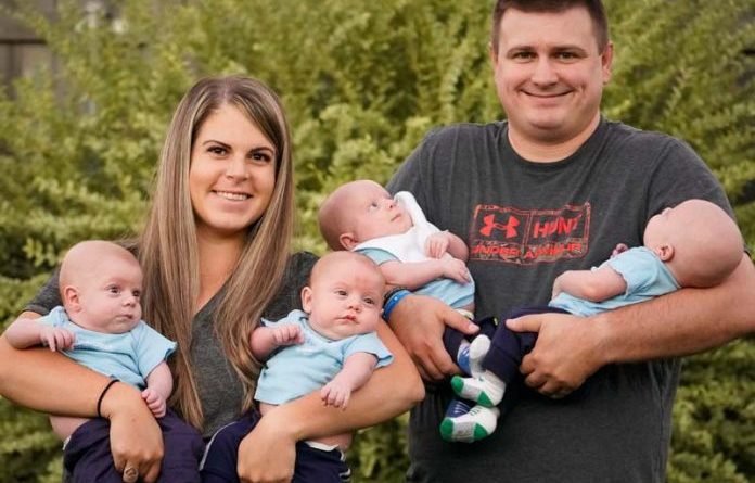 Felizmente deu tudo certo. Os bebês Austin, Daniel, Jacob e Hudson nasceram no dia 3 de julho e a família tirou a foto acima no mês passado para comemorar.