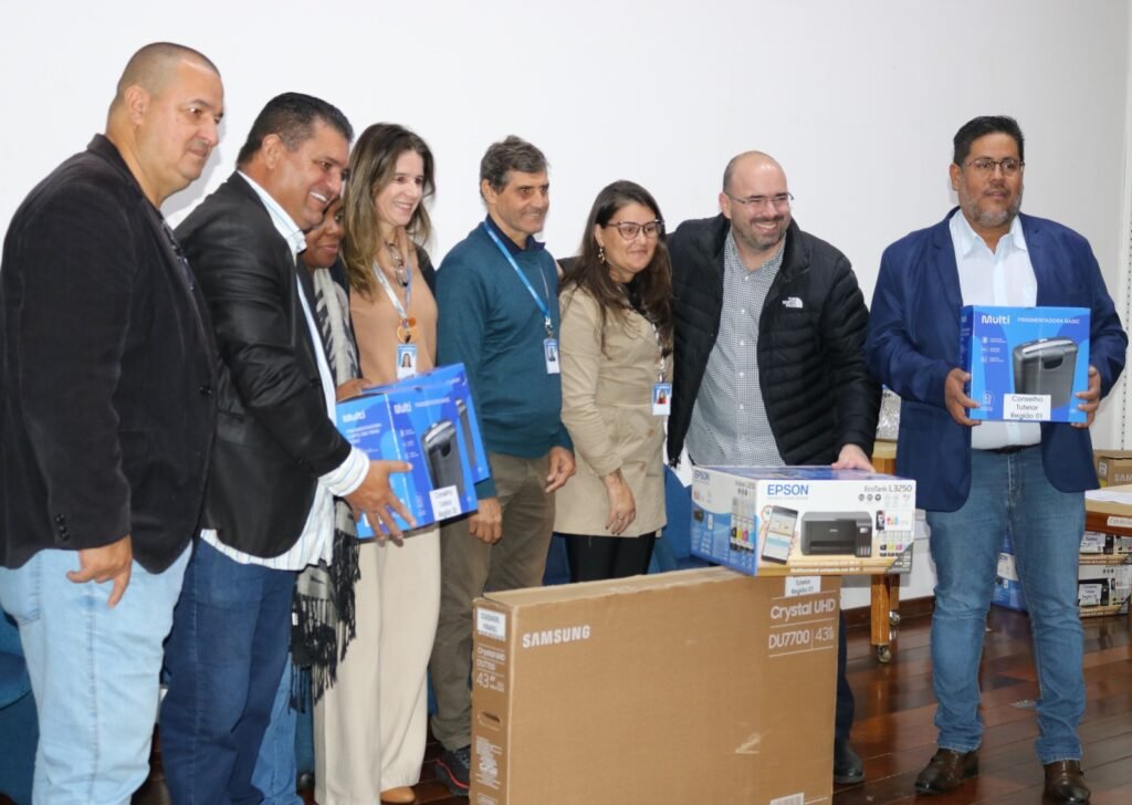 O prefeito Netto Donato entregou, nesta sexta-feira (13/6), notebooks, fragmentadoras de papel e impressoras aos quinze conselheiros tutelares que atuam na cidade. A cerimônia aconteceu no auditório do Paço Municipal e também contou com a presença do secretário de Infância e Juventude, Emerson de Morais, do vereador Dé Alvim, que representou a Câmara de São Carlos, e da vereadora Larissa Camargo.
