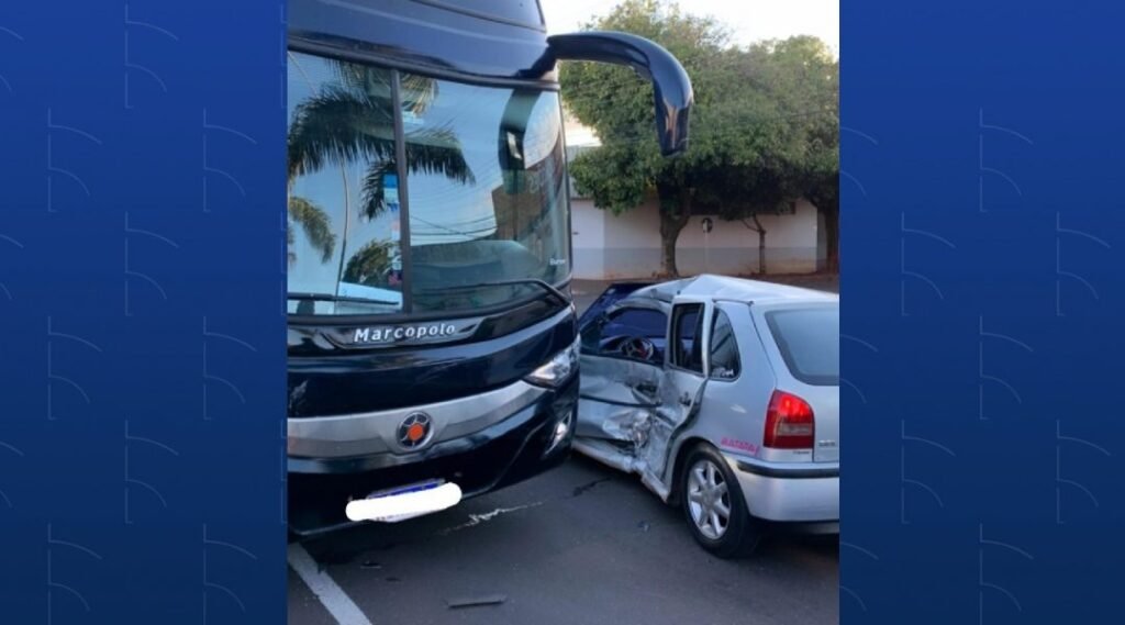 Um veículo Volkswagen Gol teria tentado realizar uma conversão à esquerda quando acabou entrando na frente do ônibus da dupla