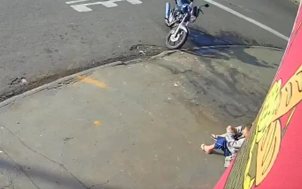 Cerca de oito minutos depois, pessoas que estavam no estabelecimento saem para ampará-lo.