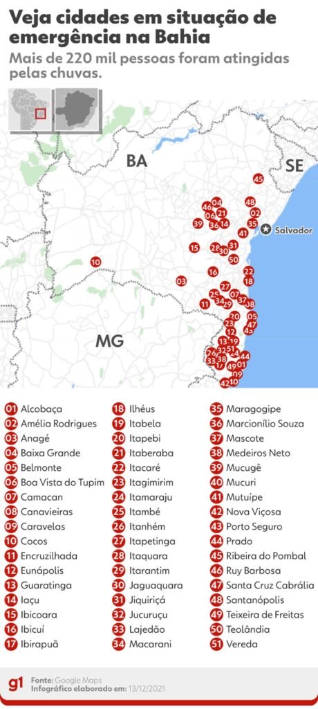 Onze pessoas morreram na Bahia em decorrência das chuvas. Na última atualização da Sudec, eram dez mortos, no entanto, no final da tarde de segunda (12), o corpo do pescador Antônio Tovi dos Santos foi localizado no rio Jucuruçu. O estado também contabiliza 267 feridos.