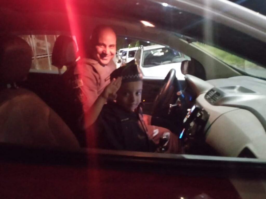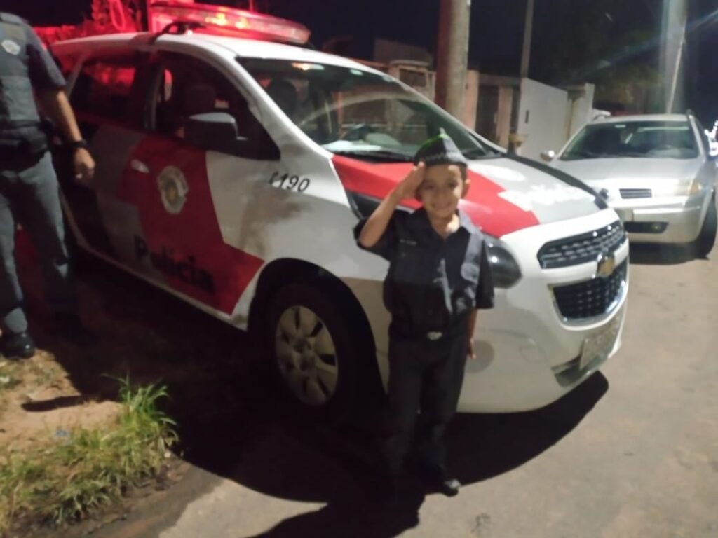 O garotinho realizou o sonho, conheceu os policiais, tirou foto e até andou de viatura.