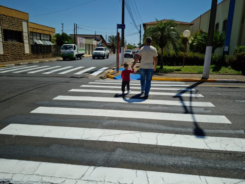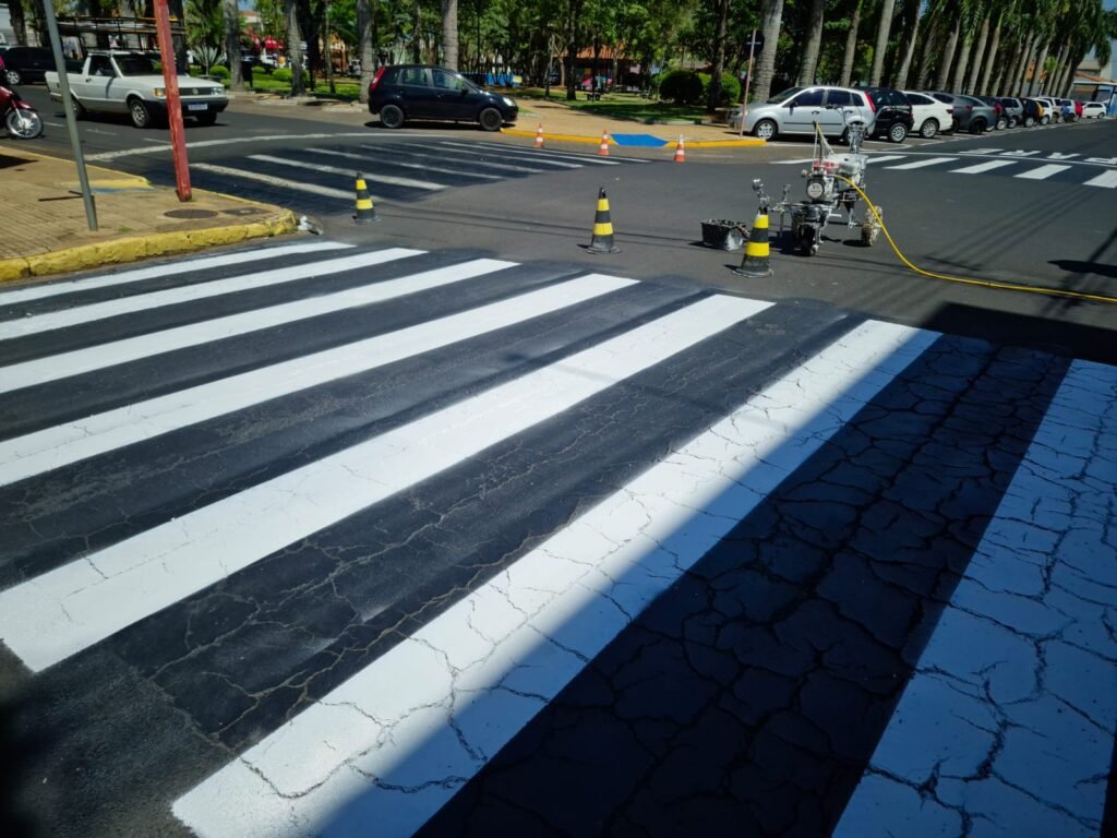 As equipes realizam a pintura de faixas de pedestres, áreas de vias rebaixadas e demais marcações necessárias para garantir mais segurança aos munícipes.
