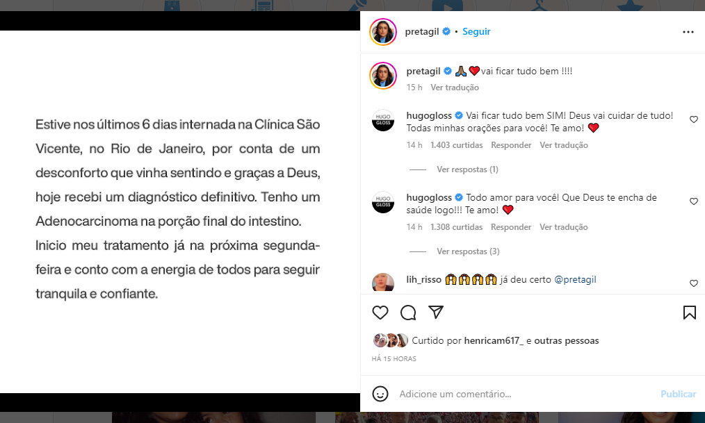 Amigos e famosos fizeram questão de deixar mensagens de apoio a Preta Gil após contar sobre o problema de saúde. “Mandando as melhores energias”, escreveu o ator Lázaro Ramos.