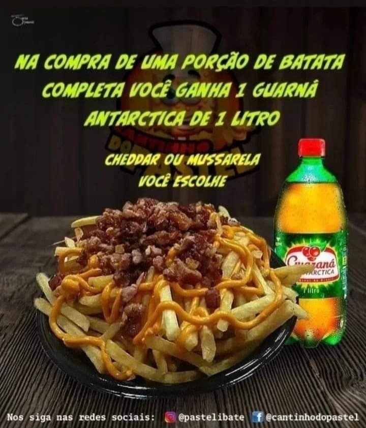 Nesta quarta-feira e quinta-feita tem promoção no Cantinho do Pastel, na compra de uma proção de Batata completa você ganha um Guaraná Antarctica de 1 litro.