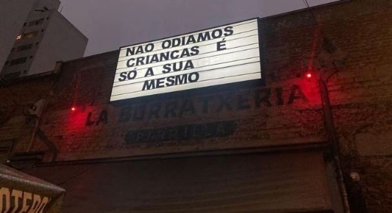 Um restaurante de Pinheiros, na zona oeste de São Paulo, chamou atenção por colocar na fachada do estabelecimento uma placa com uma frase polêmica contra a presença de crianças: “Não odiamos crianças, é a só a sua mesmo”. O restaurante muda as frases da placa constantemente.