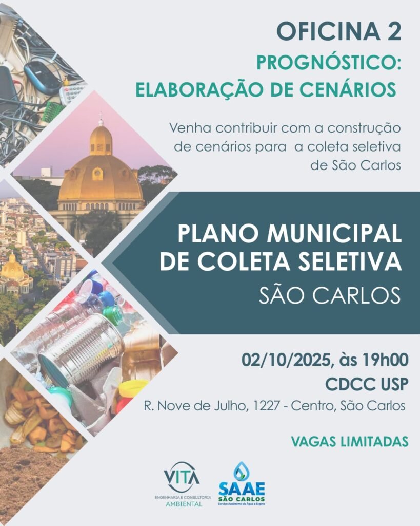 O Serviço Autônomo de Água e Esgoto de São Carlos (SAAE), em parceria com a VITA Engenharia e Consultoria Ambiental, promove no dia 2 de outubro, às 19h, no Centro de Divulgação Científica e Cultural da USP (CDCC – USP), a Oficina 2 – Síntese do Prognóstico do Plano Municipal de Coleta Seletiva de São Carlos (PMCS-SC).
