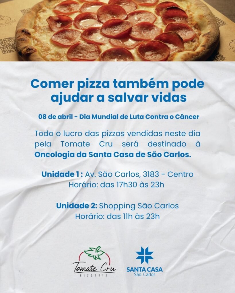A Santa Casa de São Carlos receberá mais uma ação solidária promovida pela rede de pizzarias Tomate Cru. As unidades e o serviço de delivery da franquia no município realizam, pela segunda vez, o evento beneficente Carlinha’s Day, unindo sabor e solidariedade em prol de uma causa essencial.
