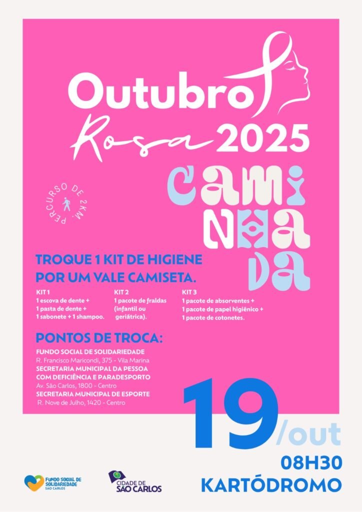 CAMINHADA – A caminhada será realizada no domingo, 19 de outubro, no Kartódromo Municipal. Às 7h30, o Studio Aline Solci fará o aquecimento dos participantes. A largada está marcada para as 8h30, com percurso de 1,6 km passando pela Avenida Liberdade, Rua Aldino Del Nero e Avenida Francisco Pereira Lopes, retornando ao ponto de partida.