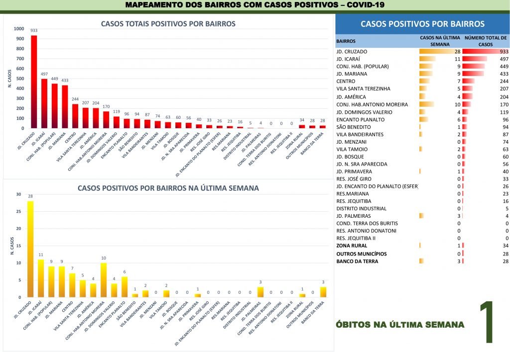 O Boletim Consolidado passou a divulgar a quantidade de casos por semana, registrados em cada bairro. O Jardim Cruzado registrou mais 28 casos na semana passada, seguido dos bairros Jardim Icaraí (11); Antonio Moreira (10); Popular e Jardim Mariana (9); Centro (7); Encanto do Planalto (6); Vila Santa Terezinha (5); Jardim América e Domingos Valério (4); Jardim das Palmeiras e Banco da Terra (3); Vila Bandeirantes e Vila Tamoio (2); São Benedito, Jardim Primavera e Zona Rural (1). Os demais bairros não registraram nenhum caso da doença.