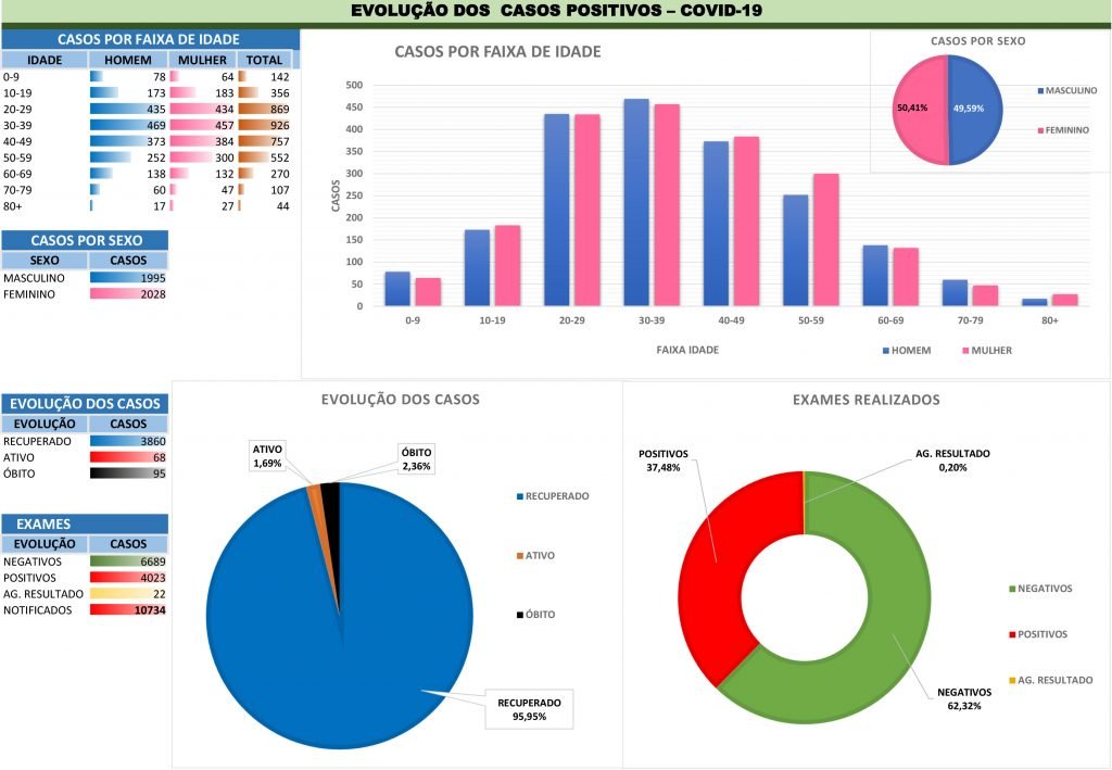 Desde o registro do primeiro caso na cidade – em abril de 2020 – até o último sábado, a cidade registrava um total de 6.689 casos negativados (62,32%) e apenas 0,20% aguardavam resultados de exames.