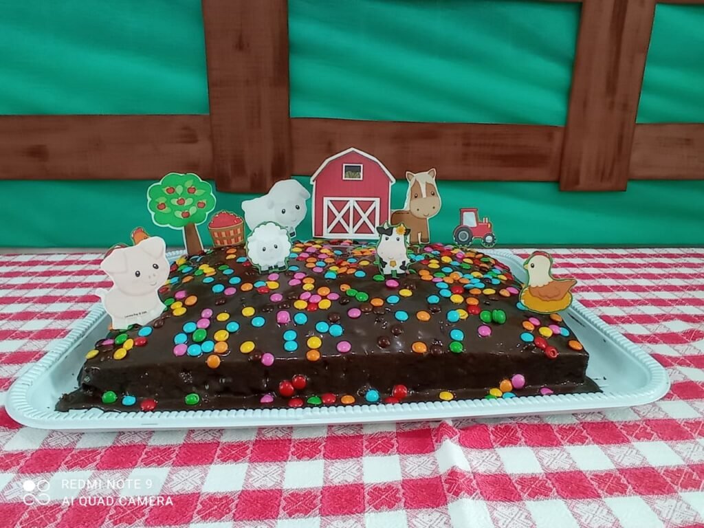 nossos pequenos: bolo de chocolate, cachorro-quente, suco, algodão-doce,