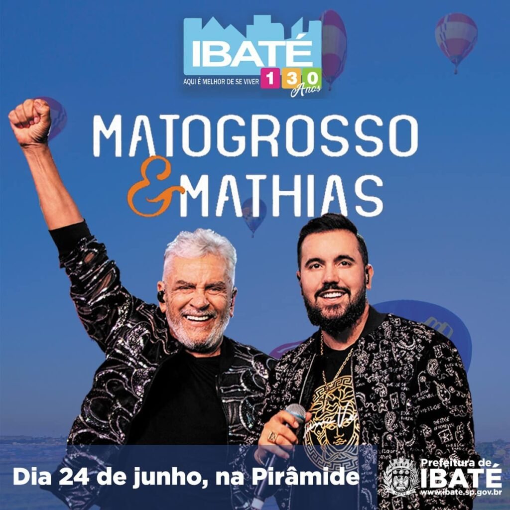 Continuando as comemorações, às 21h, na Pirâmide da Mata do Alemão, tem show com a dupla sertaneja Matogrosso & Mathias. Colecionando sucessos ao longo de mais de 40 anos de trajetória, a dupla irá interpretar canções que se tornaram clássicos do universo sertanejo. Músicas como “Tentei te esquecer”, “Boate Azul e de “De Igual pra Igual” fazem parte do repertório que será apresentado em solo ibateense.
