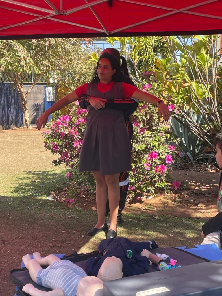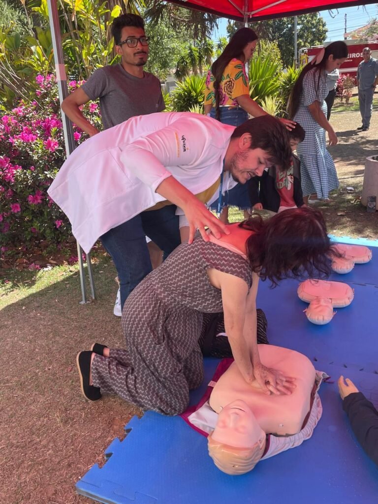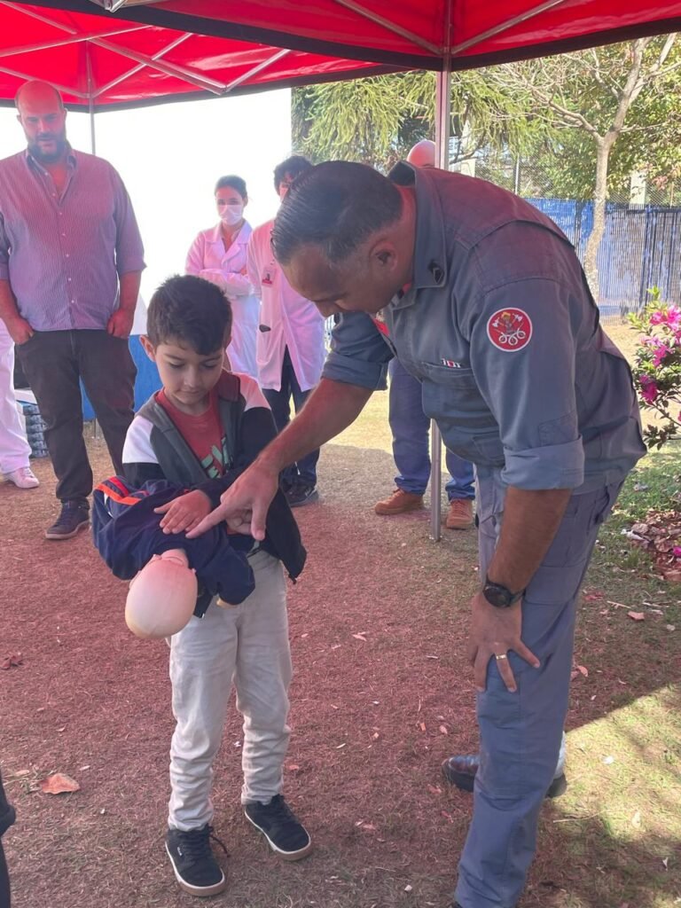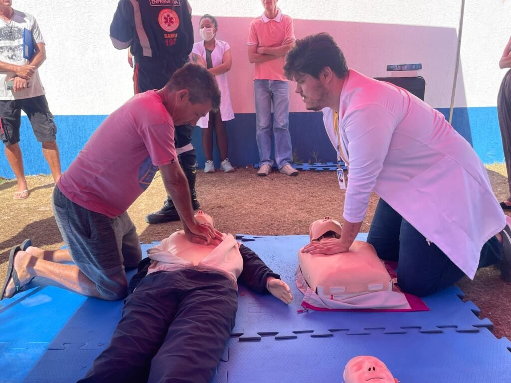 Durante a atividade, profissionais demonstraram técnicas de atendimento, com destaque para a manobra de desengasgo, em razão do aumento de casos registrados recentemente na região. Foram apresentadas formas de desobstrução das vias aéreas em diferentes públicos, desde recém-nascidos até idosos e gestantes.