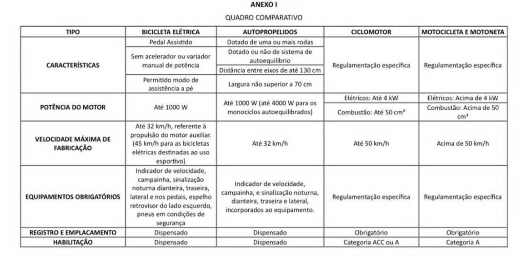 As bicicletas elétricas são aquelas com pedal e motor. A resolução determina que bicicletas elétricas e outros equipamentos com velocidade máxima de 32 quilômetros por hora (km/h) podem rodar em áreas de circulação de pedestre, com velocidade limitada a 6 km/h; e em ciclovias, ciclofaixas e ciclorrotas, conforme a velocidade estabelecia pelas autoridades naquele local.