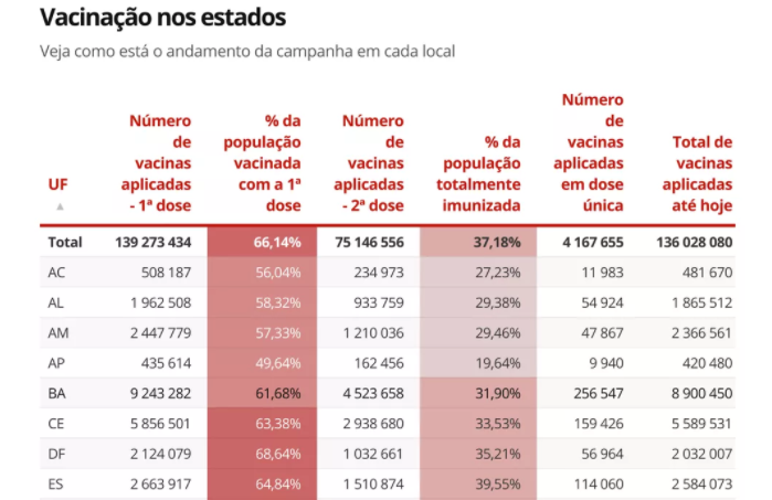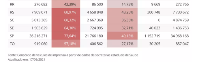 Os estados com a maior percentual da população totalmente imunizada: MS (52,28%), SP (49,57%), RS (43,74%), ES (39,93%) e PR (38,39%).