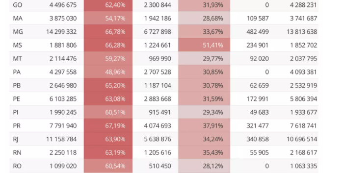 Total de vacinados, segundo os governos, e o percentual em relação à população do estado: