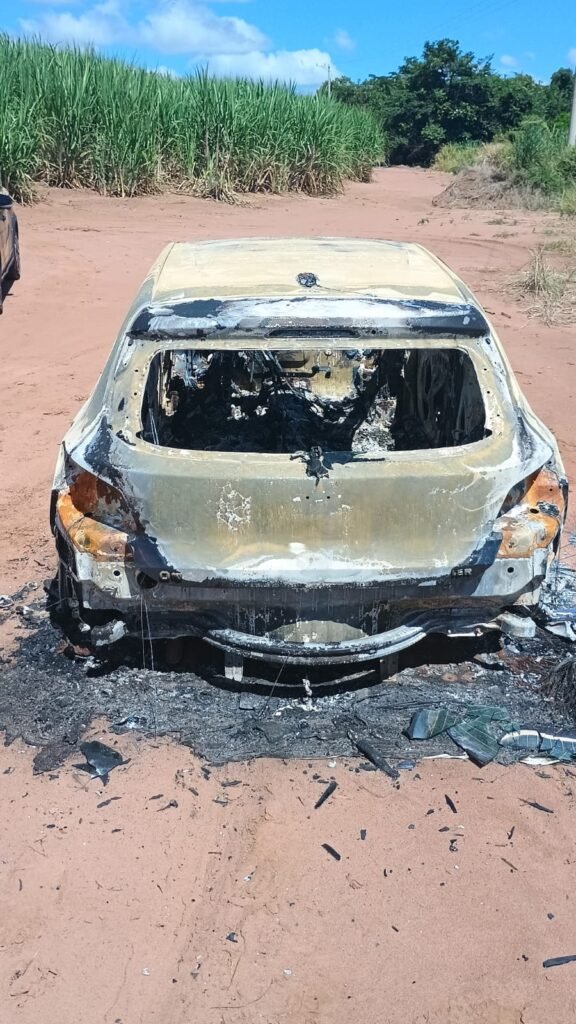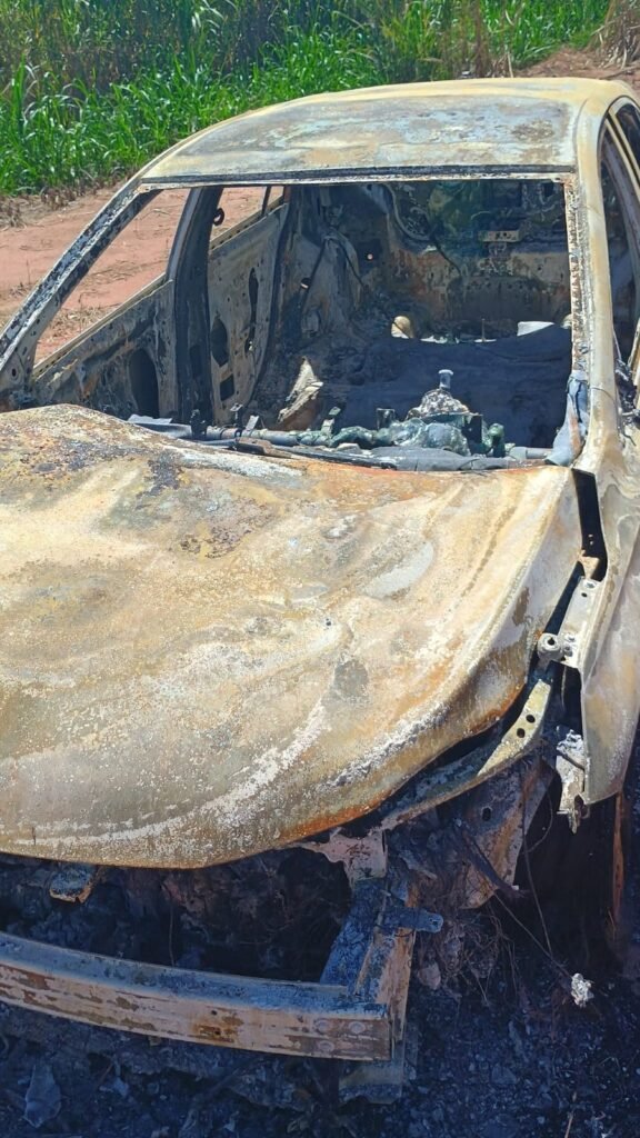 Um automóvel com registro de roubo foi localizado totalmente incendiado na manhã deste sábado (25), em uma estrada rural no sentido da Fazenda Palmital, nas proximidades da represa conhecida como “Bicudo”.