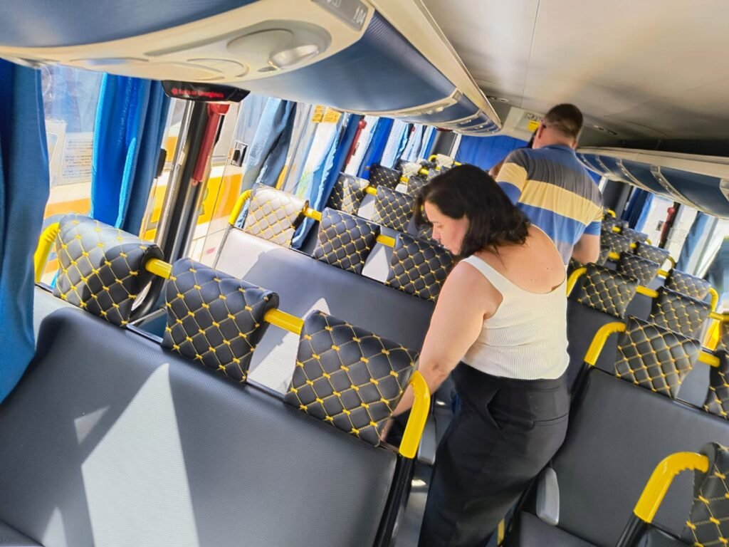 Durante a vistoria, foram avaliados diversos aspectos, como as condições gerais dos veículos, a documentação obrigatória e os itens de segurança exigidos para o transporte de estudantes.