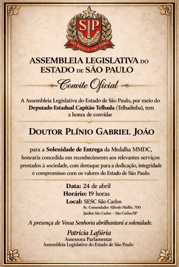 A cerimônia, realizada às 19 horas, contou com a condução do deputado estadual Capitão Telhada, responsável pela entrega da medalha em nome da Assembleia Legislativa do Estado de São Paulo (Alesp), reunindo autoridades e convidados em um momento de reconhecimento institucional.