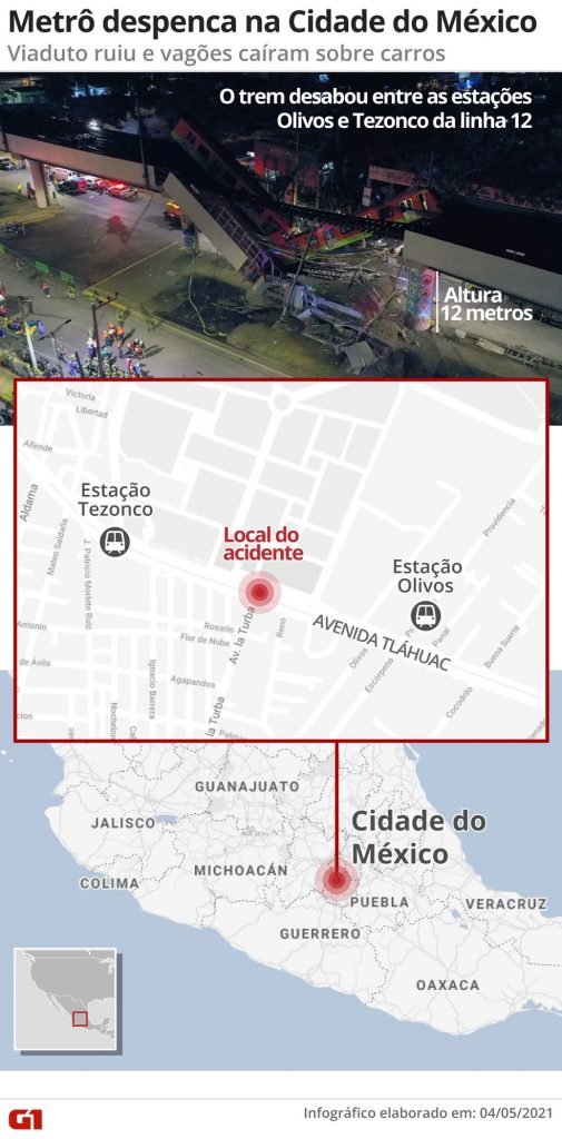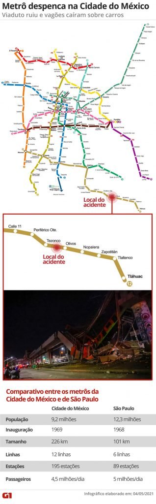 O viaduto da linha 12 do Metrô da cidade, que vai de Mixcoac a Tláhuac, ruiu entre as estações Los Olivos e Tezonco por volta de 22h30 (horário local, 0h30 de terça-feira em Brasília).